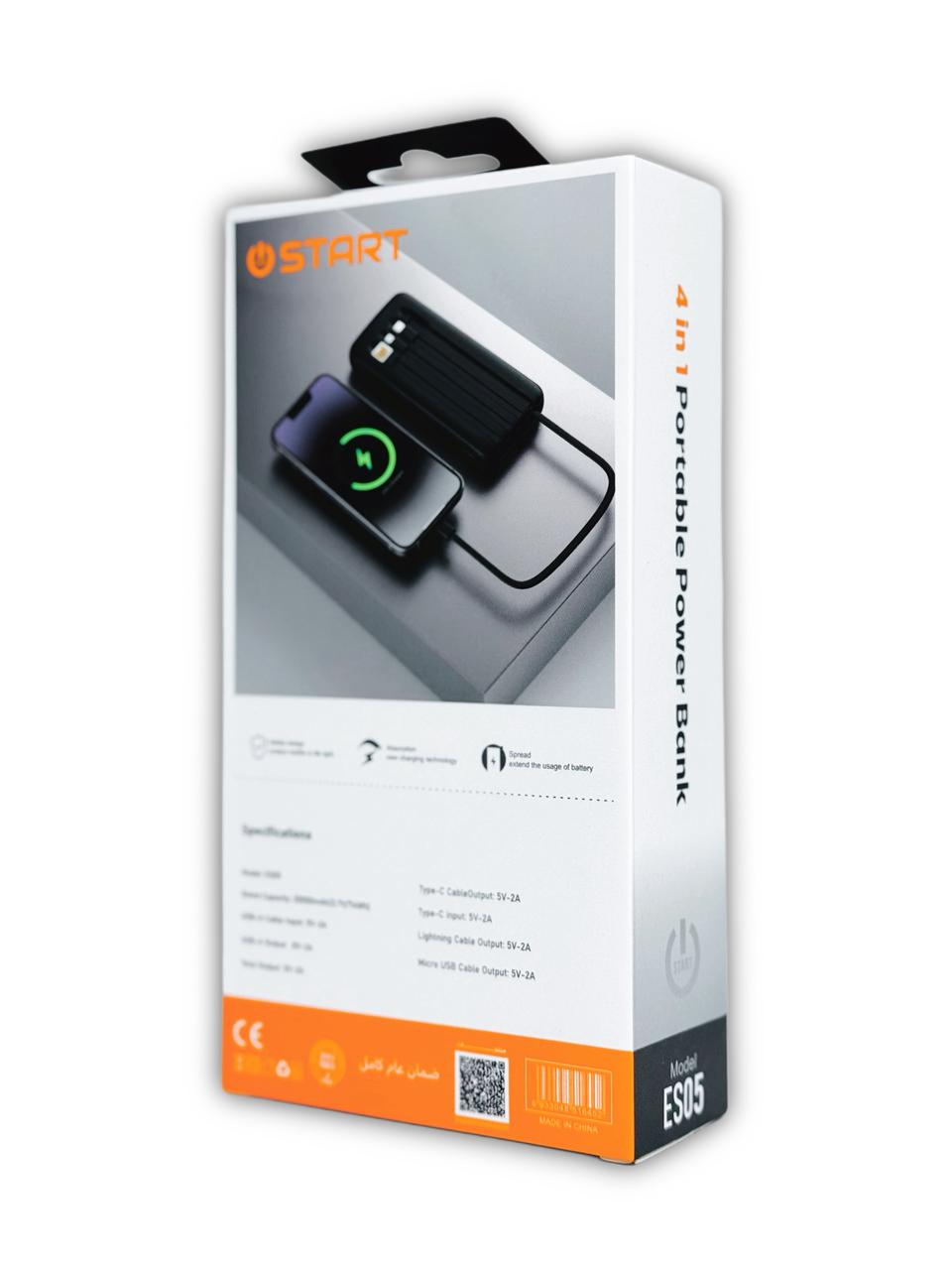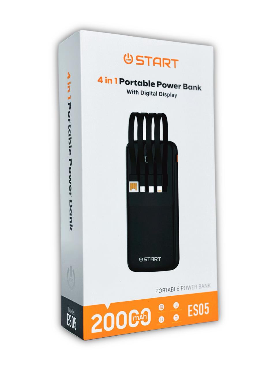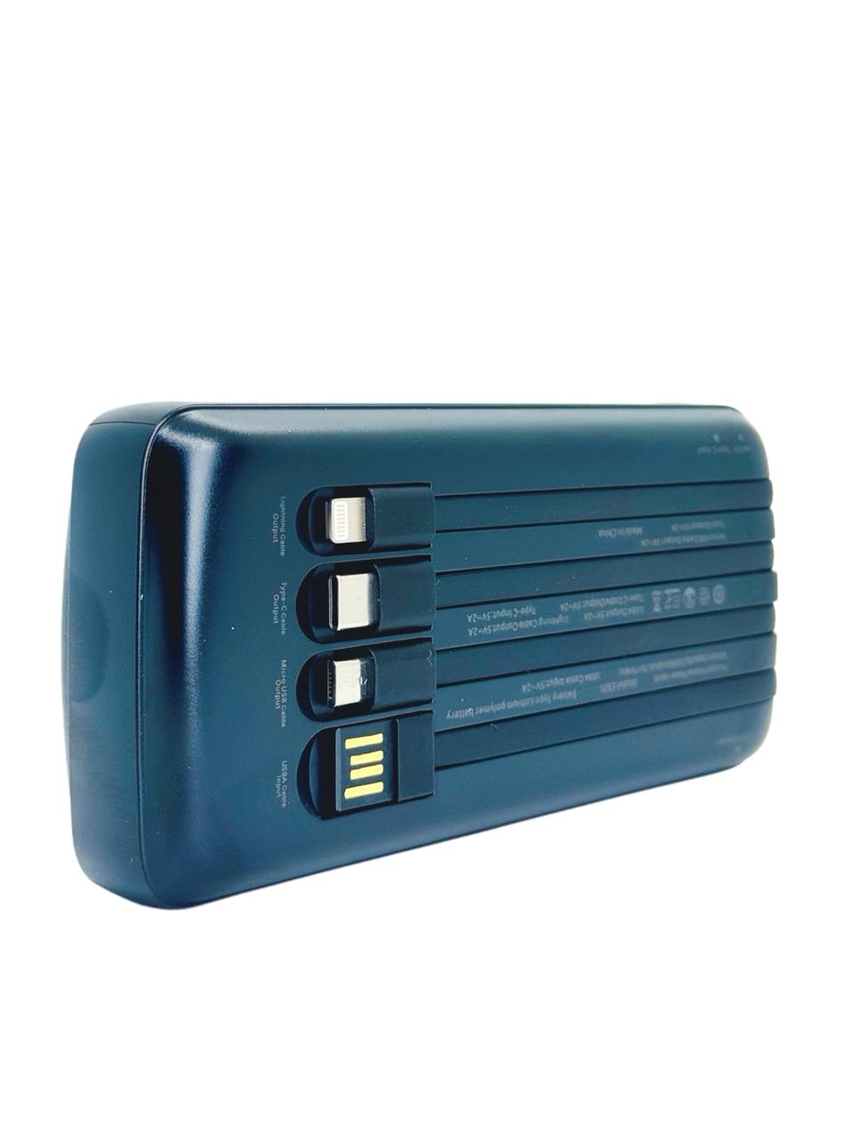 موديل ES05 هو الحل النهائي لمشكلة البطارية المنخفضة. يأتي بسعة ضخمة تصل إلى 20,000mAh تكفي لشحن هاتفك عدة مرات. يتميز بوجود 4 كابلات مدمجة (USB, Type-C, Lightning, Micro) مما يعني أنك لن تحتاج لحمل أي أسلاك إضافية. مزود بشاشة ديجيتال دقيقة توضح نسبة الشحن المتبقية لتبقى دائماً على علم بحالة الطاقة لديك.
