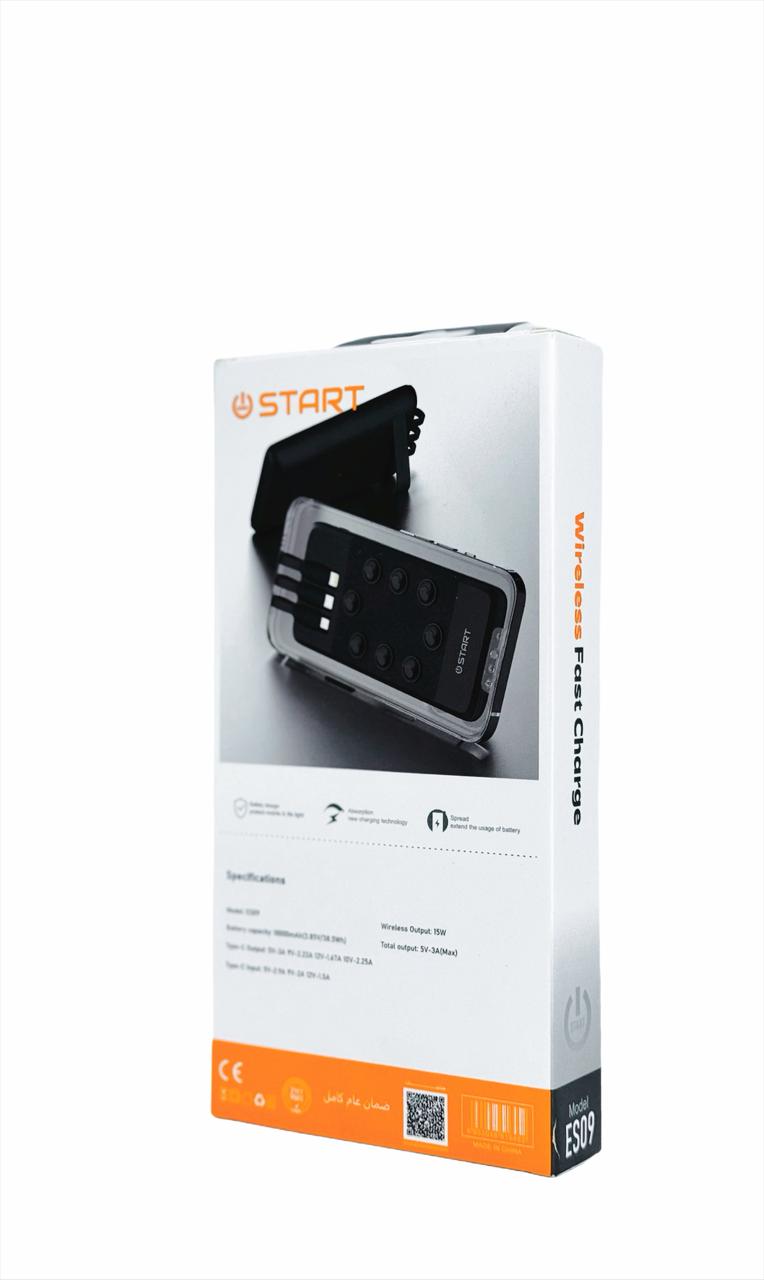 START ES09 معمول لراحة أكتر. بيجمع بين الشحن اللاسلكي والكابلات المدمجة (3 أنواع) علشان تستخدميه مع أي جهاز بدون ما تشيلي كابلات إضافية. بسعة 10000mAh مناسب للاستخدام اليومي، وتصميم عملي منظم يخلي كل حاجة في مكانها.