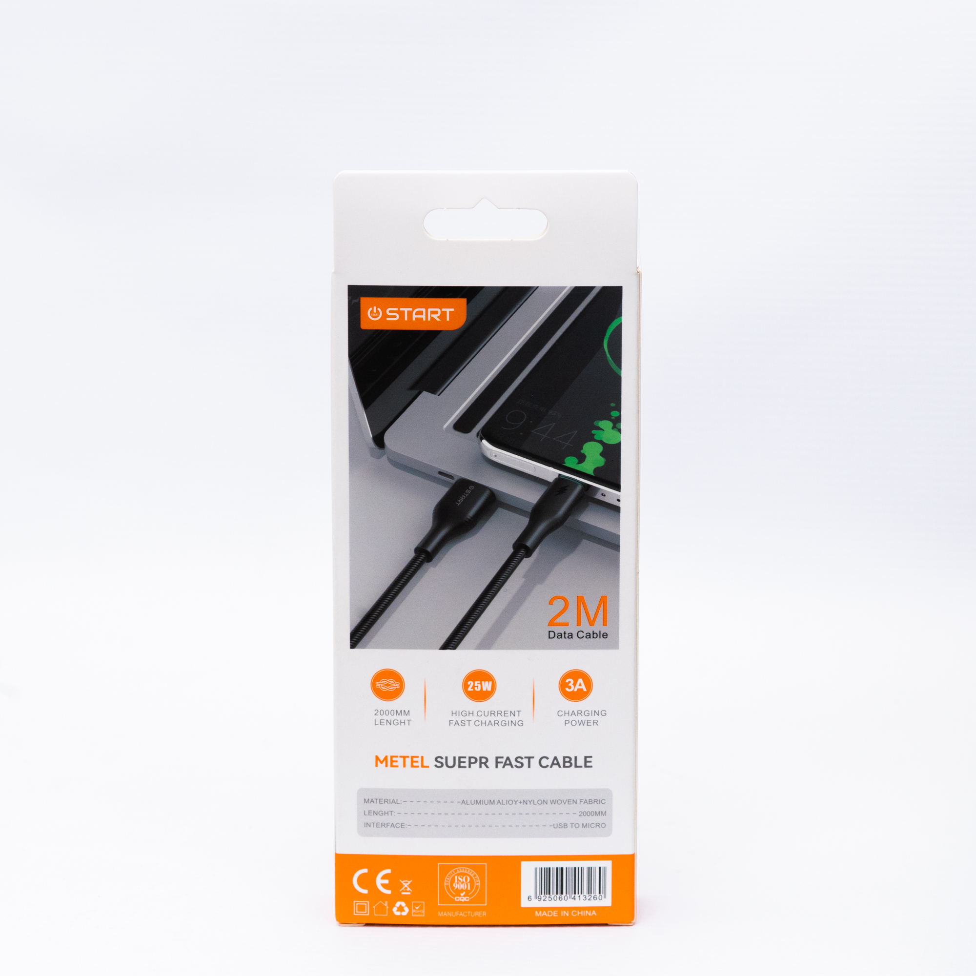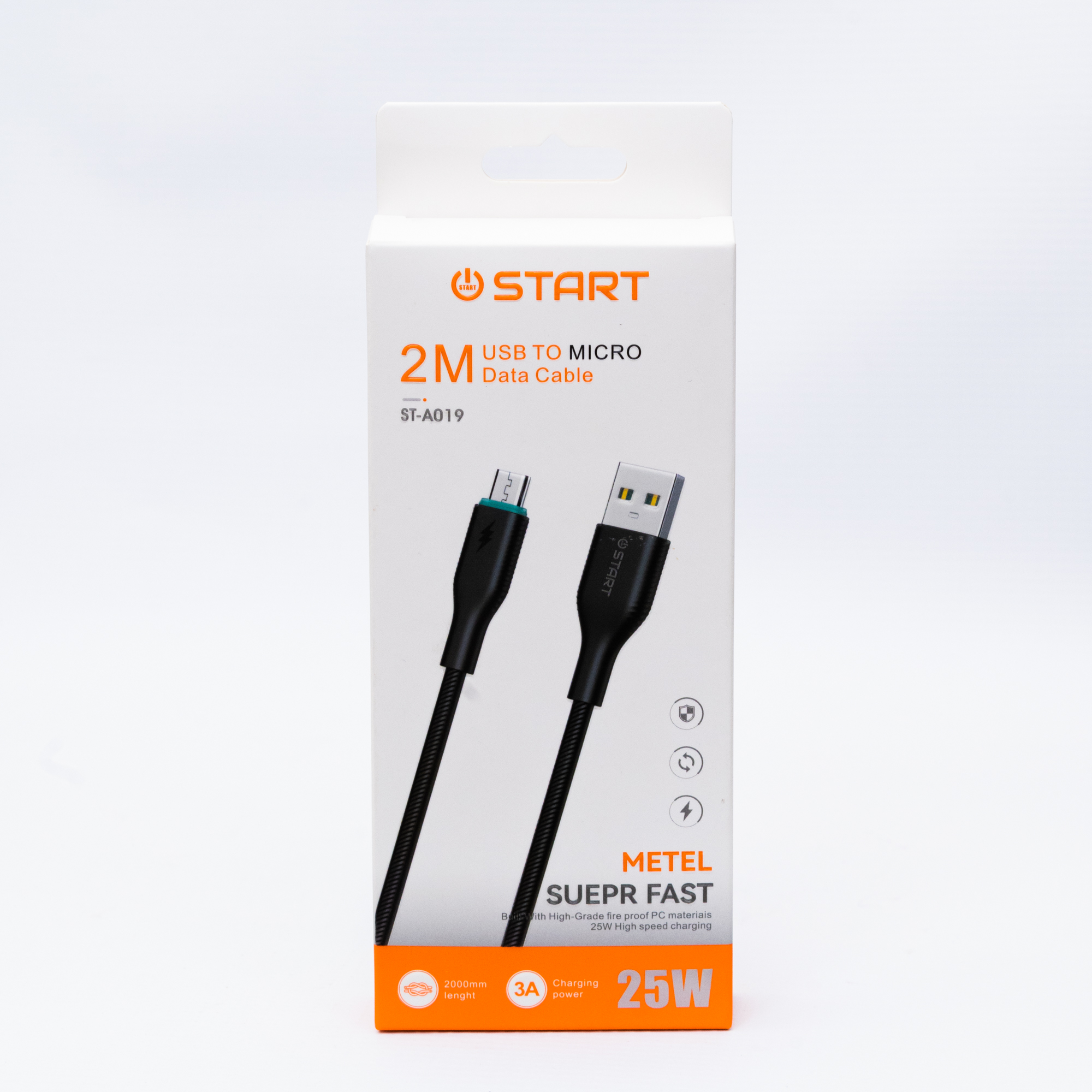 كابل **START ST-A019 M** بطول **2 متر** يوفر لك راحة تامة أثناء الاستخدام، مع قدرة **25 واط** وتيار **3A** لتجربة شحن سريع ومستقر لأجهزتك بمنفذ **Micro**.